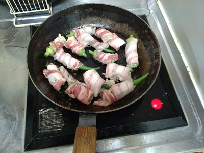 オクラの豚巻き 2024年08月22日 日々徒然 0 http://1cm3.mamagoto.com/%E6%97%A5%E3%80%85%E5%BE%92%E7%84%B6/%E3%82%AA%E3%82%AF%E3%83%A9%E3%81%AE%E8%B1%9A%E5%B7%BB%E3%81%8Dオクラの豚巻き 実家に帰省した時に食べた料理。美味しかったので、作ってみました。初めにちょっと両面焼いてから、タレを入れます。 タレは、みりんとだしつゆと砂糖で作りました。割とおいしくできました。 [1回]