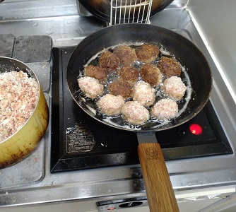玉ねぎを炒めて、ひき肉と卵と混ぜて・・・