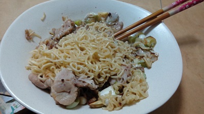 お皿に移して、インスタント麺を同じフライパンで少なめの水でほぐします。