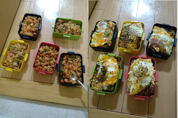 そのあと、卵を1食につき、3.5個ずつ贅沢に使ったら、オムライス弁当の完成です。