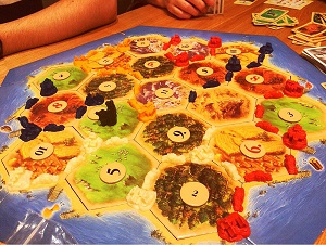 (写真は、「カタン」というゲーム。島を開発していくゲームの様子)